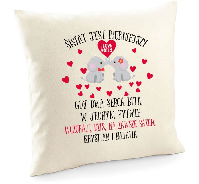 Poduszka ze słoniami Świat jest piękniejszy, gdy dwa serca biją w jednym rytmie. Poduszki spersonalizowane imionami pary.