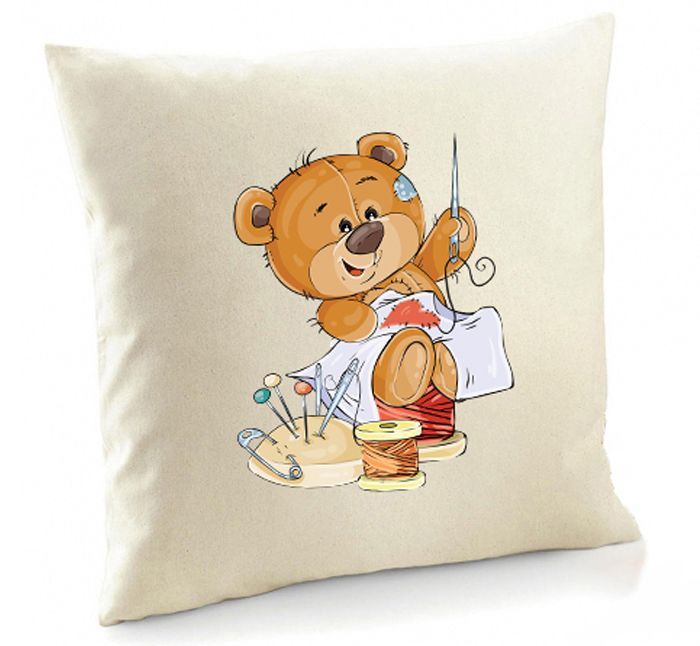 Poszewka Misiu szyje łatkę na ubraniu w kształcie serduszka, a obok niego przybory krawieckie, szpulki nici i poduszka z igłami.