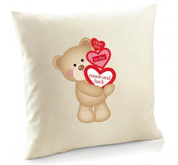 Poszewka piramidka z serduszek trzymana przez słodkiego misia.