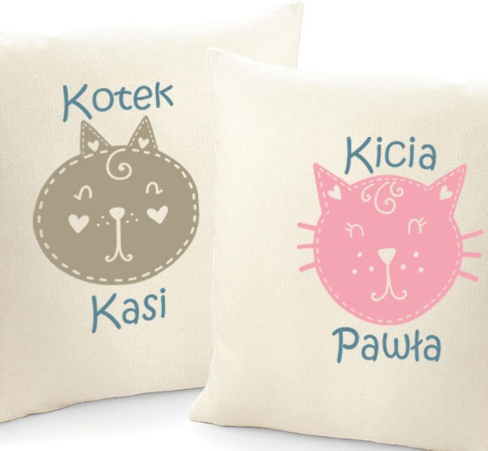 Zestaw poduszek dla pary składa się z dwóch sztuk poszewek razem z wypełnieniami. Każda poduszka ma inny nadruk. Jedna jest przeznaczona dla niego, a druga dla niej.