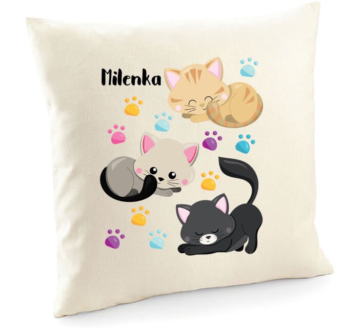 Poszewka ma piękny nadruk trzech wesołych kotków. Każdy kot jest inny. Ma inną pozę i kolor. Pierwszy kot od góry jest pomarańczowo-miodowy. Jest zwinięty i pięknie śpi. Ma podwinięty ogon. Główkę trzyma na łatkach. Drugi kotek jest szary i beżowy. Jego ogon jest czarny i długi. Leży w podobnej pozycji, lecz jest bardziej uważny. W każdej chwili może wykonać skok. Trzeci kotek jest czarny. Uroczo się przeciąga. Ma do góry zadarty ogon.