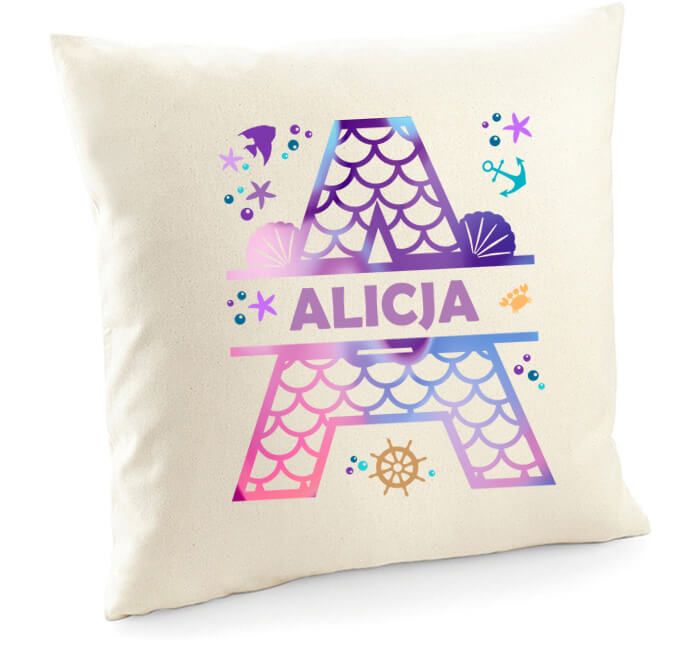 Poszewka Syreni ogon z imieniem dziewczynki zachwyci każdą królewnę. Ta strona dotyczy poszewki zapinanej na zamek. Do niej koniecznie trzeba dobrać wkład do środka, aby skompletować całą poduszkę. Na poszewce jest wielka literka, na którą zaczyna się imię dziecka. Wszystkie imiona alfabetu są dostępne. Wśród zdjęć są przykłady: Alicja, Natalia i Ola. Drukujemy dowolne.