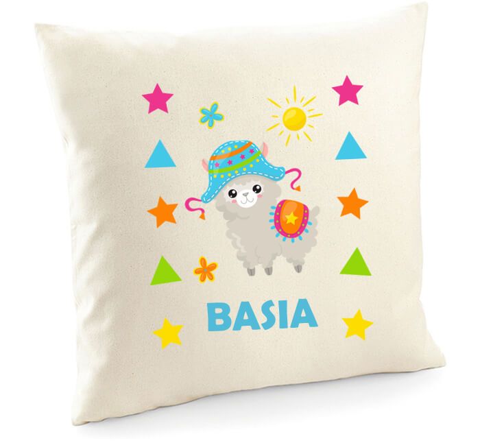 Poszewka z lamą w czapce z imieniem dziecka. Tutaj jest przykładowo imię Basia. Wpisz swoje w miejscu na personalizację. Przedmiotem oferty jest poszewka. Dokup do niej wkład.