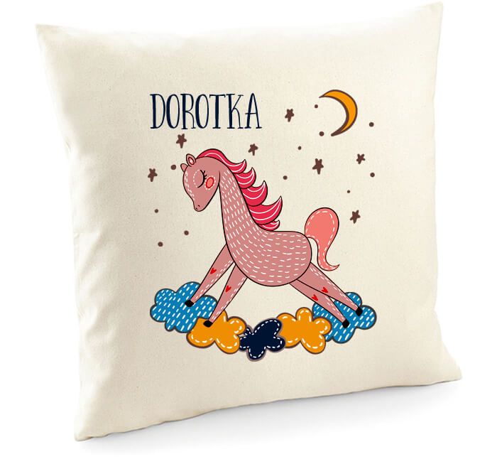 Poszewka z konikiem na chmurkach z imieniem dziecka. Wpisz swoje w miejscu na personalizację. Przedmiotem oferty jest poszewka. Dokup do niej wkład.