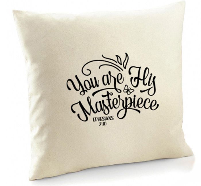 Poszewka z cytatem z Biblii You are His masterpiece luźno przetłumaczone może zabrzmieć Jesteś Jego dziełem. W polskim przekładzie w liście do Efezjan możemy przeczytać: Jesteśmy bowiem dziełem samego Boga! Stworzył nas na nowo w Chrystusie Jezusie, byśmy wykonywali te dobre rzeczy, które On od dawna zaplanował.