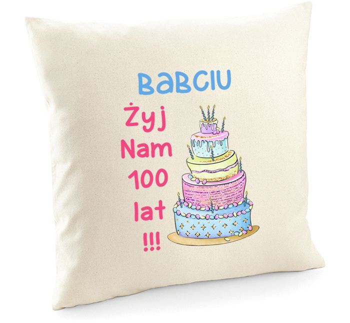 Poszewka Babciu żyj Nam sto lat z kolorowym słodkim tortem.