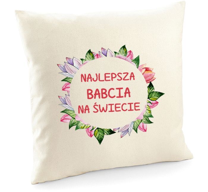 Poszewka Najlepsza Babcia na świecie z czerwonym napisem oraz ozdobnymi listkami.