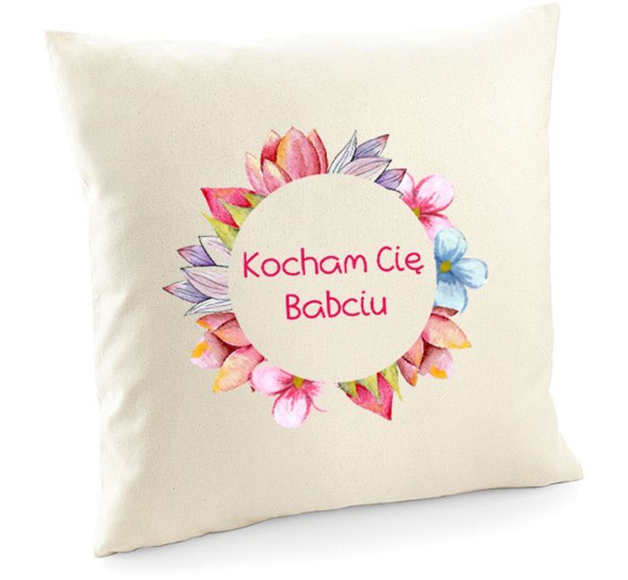 Poszewka Kocham Cię Babciu. Trochę kwiatków, trochę bratków, trochę róż, listków kolorowych i mamy wzór już. Piękna poszewka w beżowym kolorze ładnie zgrywa się kolorami nadruku.
