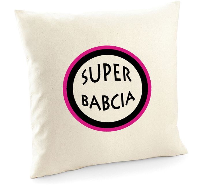 Poszewka Super Babcia ma bardzo prosty i wyrazisty wzór. To jakby przycisk. Użycie tylko dwóch kolorów potęguje przesłanie.