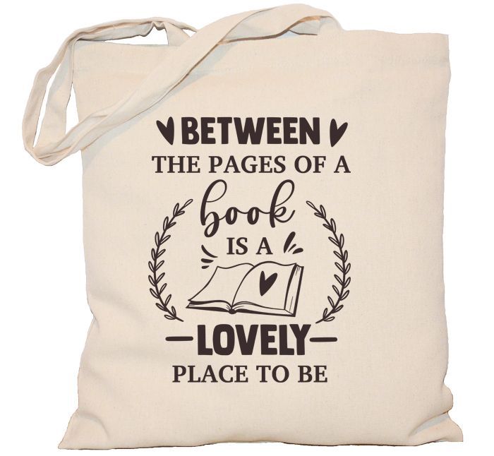 Torba dla miłośnika czytania z napisem "Between the pages of a book is a lovely place to be". Pomiędzy stronami książki jest piękne miejsce by w nim być