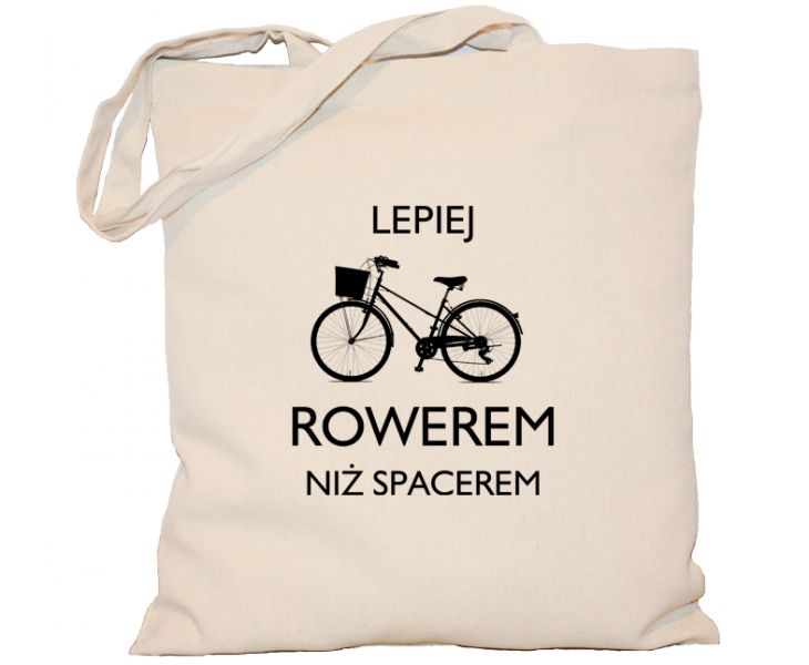 Torba Lepiej rowerem niż spacerem. Wygodna torba do użytku codziennego dla fana roweru. Długie uszy pozwalają na przenoszenie jej na ramieniu. Napis na torbie oddaje upodobanie rowerzystów. Prawdziwi amatorzy tego sportu zawsze wybierają rower.