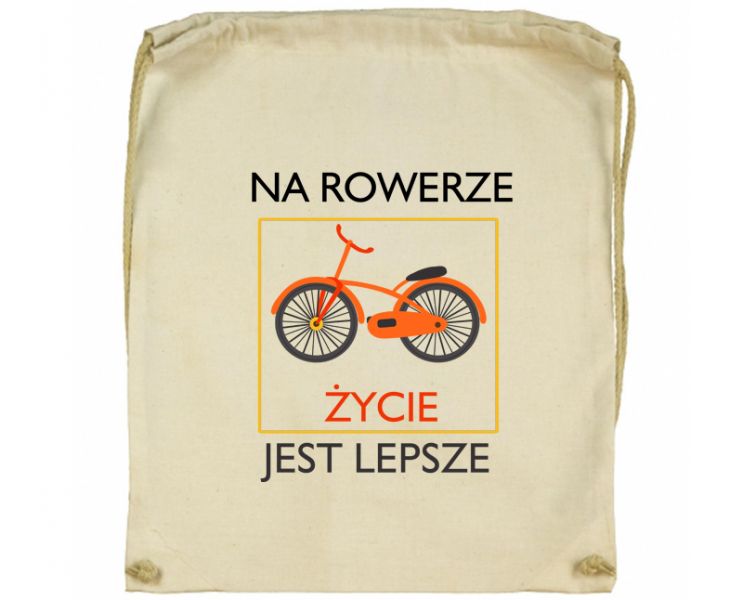 Workoplecak Na rowerze życie jest lepsze. Workoplecak zamykany jest na bawełniany sznurek. Jest to wygodne rozwiązanie dla rowerzystów, bo nosi się go na plecach i nie przeszkadza podczas jazdy. Sznurek można łatwo wymienić i zmienić w ten sposób jego wygląd.