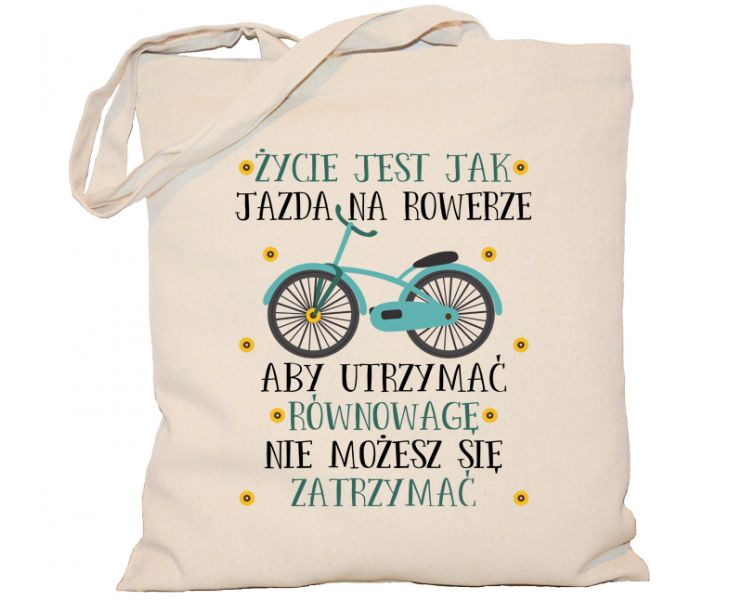 Torba Życie jest jak jazda na rowerze, aby utrzymać równowagę nie możesz się zatrzymać. W życiu ciągle trzeba iść do przodu. Mówią, że jak staniesz w miejscu to zaczniesz się cofać. Codziennie nasz świat się zmienia i ciągle zmusza Nas do zmiany. Ważne, aby nie iść ślepo za głównym nurtem, ale aby żyć zgodnie ze swoimi przekonaniami.