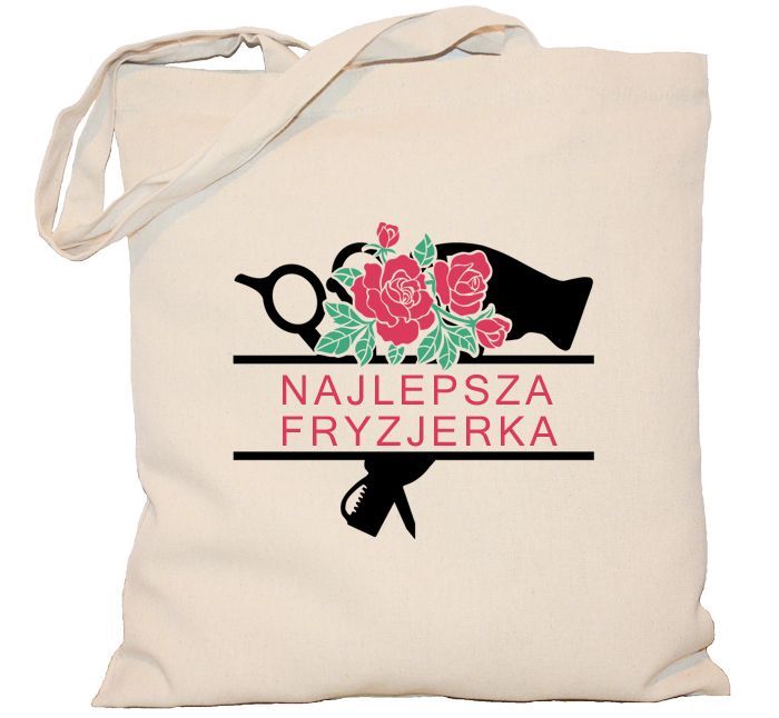 Torba dla najlepszej fryzjerki z przedstawionymi nożyczkai i suszarką ozdobionym kwiatem.