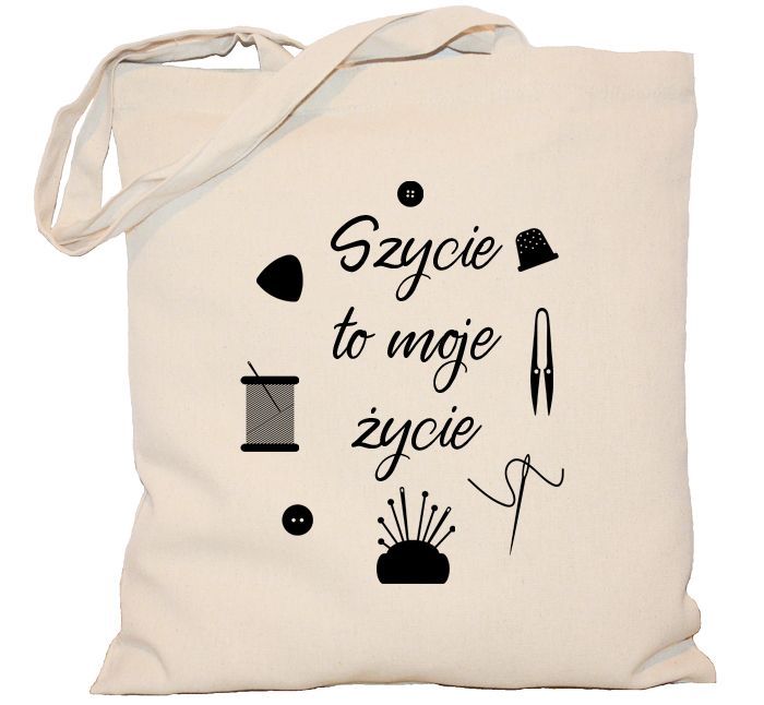 Torba na ramię to praktyczny prezent na wiele okazji. Torba z napisem szycie to moje życie celuje w grupę zawodową związaną szyciem. Na torbie wokół hasła znajdują się akcesoria krawieckie, co jeszcze dokładniej podkreśla charakter torby. To co w życiu przy krawieckiej maszynie zawsze się znajdzie, to poduszeczka ze szpilkami, mydełko, naparstek, choć pewnie rzadko używany, obcinaczki do nitek i guziki.