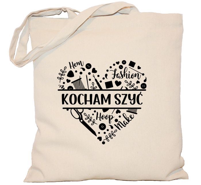 Torba bawełniana dedykowana krawcowym przedstawia ułożone serce z akcesoriów krawieckich i słów oraz gałązek z liśćmi. W poziomie po środku serca jest wydzielone miejsce na napis. Widnieje tutaj hasło przewodnie życiowej drogi Krawcowych "Kocham szyć". Z miłością do szycia jest jak z prawdziwą relacją. Jest czas na zakochanie i na wierne trwanie. Po kilku latach, gdy zachwyt już trochę opada i okazuje się, że nie jest to najłatwiesza praca, może szycie nie jest już tak uwielbiane, ale za to staje się praktyczne i szybsze. Z czasem poziom umiejętności rośnie i szycie idzie sprawniej. Umiejętność szycia jest bardzo cenna. W końcu każdy z Nas nosi ubrania.Torba dla krawcowej jest fajny prezentem. Może też być reklamowym gażetem. Napis można dowolnie zmienić. Jeśli chcesz spersonalizować wydruk napisz w zakładce "Personalizuj" co innego wpisać. Moży być np. imię.