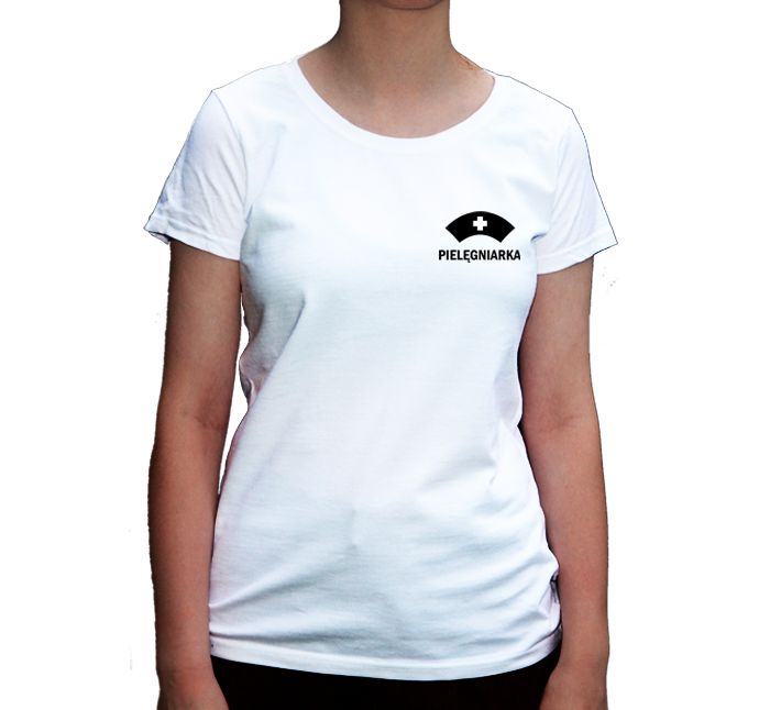 Koszulka dla pielęgniarki ma małe logo na piersi w postaci pielęgniarskiego czepka i napisu pielęgniarka. W szpitalu takie oznakowania są niezwykle przydatne. Nikt nie chce zgadywać, kto jest kim i lawirować słowami w swoich wypowiedziach. Wygodna koszulka z łatwością może zastąpić medyczny uniform. Mały nadruk jest bardzo estetyczny i pełni funkcję informacyjną.