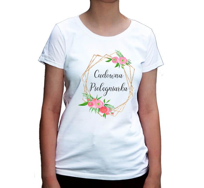 Koszulka Cudowna Pielęgniarka z pięknymi ozdobnymi stroikami z kwiatów. Całość grafiki okala kilka rombów w kolorze złota. Koszulka dla pielęgniarki jest świetnym prezentem dla tak wyjątkowej osoby. Często ten zawód jest mocno niedoceniany, ale każdy pacjent potwierdzi, że ich praca jest nieodzowna. Nikt nie wyobraża sobie placówki medycznej bez pomocy pielęgniarskiej.