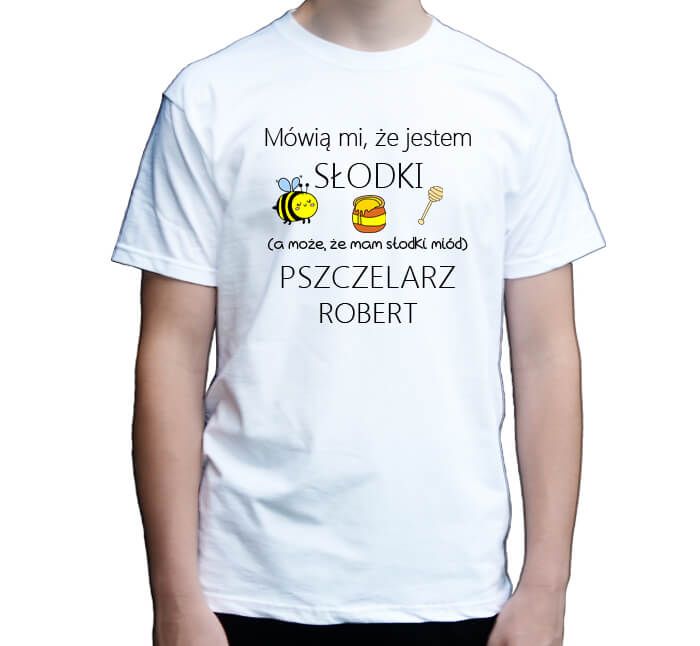 Koszulka pszczelarska Mówią mi, że jestem słodki. Koszulkę należy spersonalizować imieniem słodkiego pszczelarza.