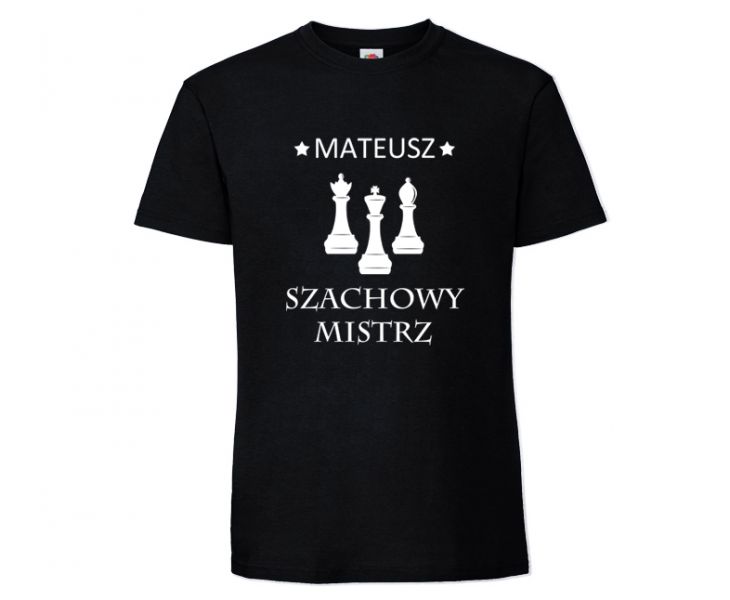 Szachowy mistrz Koszulka męska z imieniem. Koszulka posaida nadruk figur szachowych. Na pierwszym lanie jest król. Po prawej stronie od niego stoi laufer, a po lewej królówka, czyli najsilniejsza figura w szachach. Nad bierkami jest wydrukowane imię. To może być również ksywka trenera lub członka klubu szachowego. W zakładce personalizuj podaj wybrane imię i koniecznie zapisz swój wybór w prawym dolnym rogu.