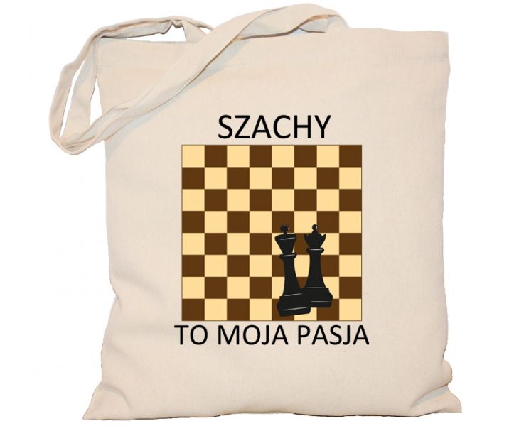 Torba płócienna przydaje się codziennie. Nadruk szachownicy wskazuje na zainteresowania osoby noszącej tą torbę. Napis "Szachy to moja pasja dobitnie o tym świadczy.