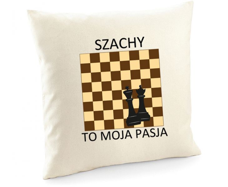 Poszewka na jaśka w wymiarze 40x40cm z nadrukiem szachownicy i napisu "Szachy to moja pasja".