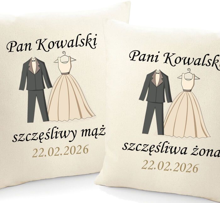 Poduszki na ślub z nazwiskiem Pan i Pani. Zestaw składa się z 2 sztuk