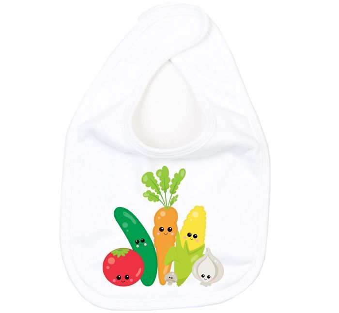 Śliniaczek Warzywka jest z wesołą animowaną gromadką warzyw. Przy posiłku możesz dziecku pokazać i opowiedzieć jak wygląda ogórek, marchewka, kukurysza, pomidor i cebulka.