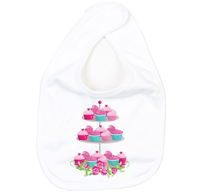 Śliniaczek z paterą babeczek. Babeczki są różowe. Te w różowych papilotkach są udekorowane ciemno różowymi serduszkami. Pozostałe babeczki są w niebieskich papilotkach. Babeczki są ułożone na trzech piętrach patery. Na dolnym talerzu są róże.