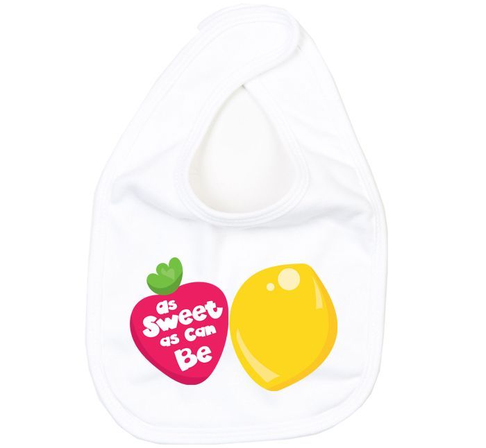 Śliniaczek Truskawka i cytryna. Truskawka ma wewnątrz napis "as sweet as can be"