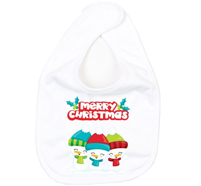 Śliniak Bałwanki. Świąteczne bałwanki stoją w trójkę razem a nad nimi widnieje napis Merry Christmas.