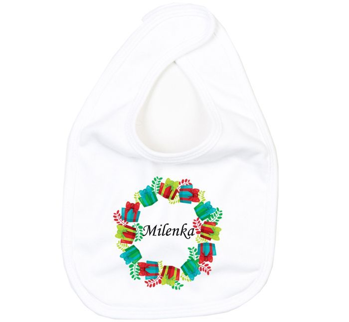 Śliniak z imieniem w wianuszku ułożonym w koło z prezencików na święta Bożego Narodzenia