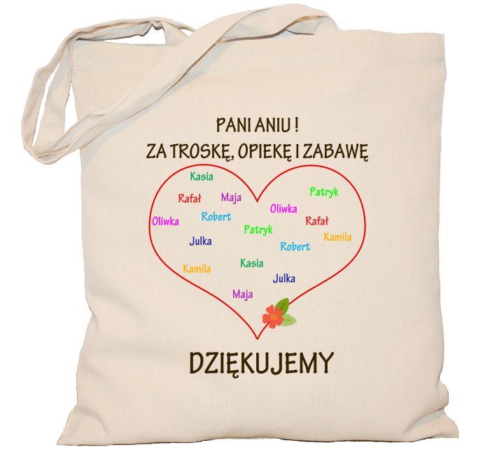 Torba Przedszkolanki z imieniem i tekstem za troskę, opiekę i zabawę dziękujemy. W sercu można wypisać imona dzieci grupy przedszkolej.