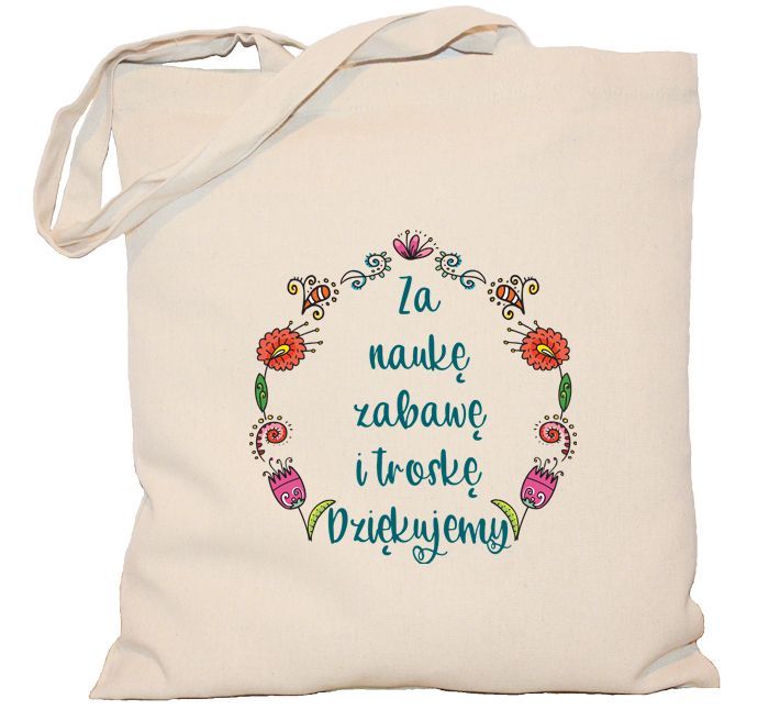 Torba Za zabawę naukę i troskę Dziękujemy to propozycja spersonaliwana na zakończenie kolejnego roku szkolnego. Podpis można dowolnie modyfikować. Można użyć nazwy grupy lub tylko wypisać rocznik. Całkowita dowolność. Wybrany napis można napisać w komentarzu w podsumowaniu koszyka.