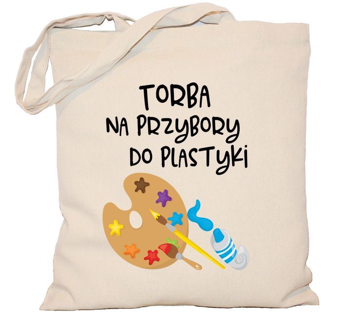 Torba na przybory do plastyki przydaje się nauczucielom i uczniom. Na zajęcia plastyki zawsze jest coś do przyniesienia. Na torbie widać kolorową paletę, farby i pędzle.