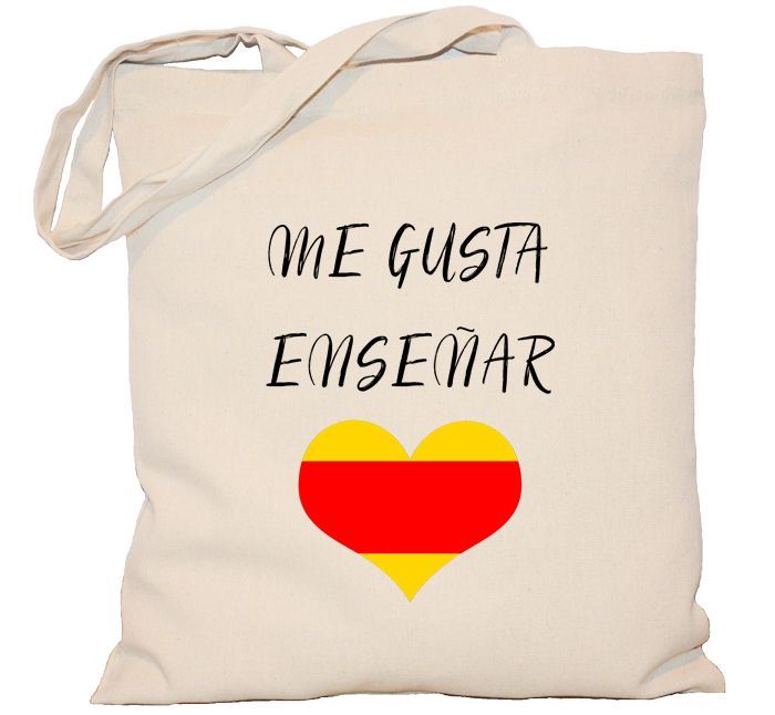 Torba Me gusta ensenar, czyli lubię uczyć po hiszpańsku jest ozdobiona sercem w kolorach hiszpańskiej flagi.