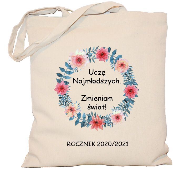 Torba Uczę Najmłodszych. Zmieniam Świat. Napis wpisany w kolorowy, kwiatowy wianek. Torba dla nauczycielki przedszkola podpisana rocznikiem lub nazwą grupy.
