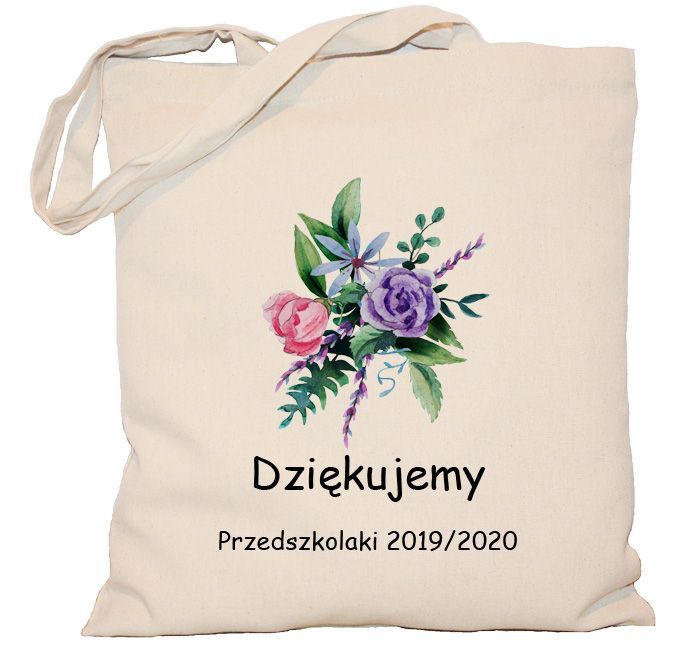 Torba Dziękujemy z bukietem kwiatów i podpisem grupy przedszkolnej.