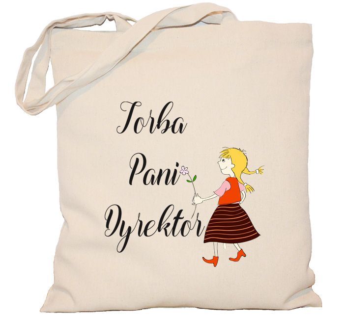 Torba Pani Dyrektor szkoły podstawowej lub przedszkola, na której mała dziewczynka wdzięcznie trzyma jednego kwiatka. Kierowanie placówką edukacyjną wcale nie jest łatwe i przy prowadzeniu lekcji lub zajęć z dziećmi do poprowadzenia pozostaje cała administracja, układanie planów i zarządzanie kadrą.