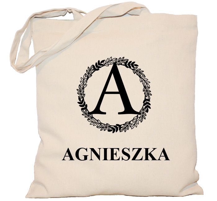 Torba z monogramem oraz imieniem. Dostępne są wszystkie litery alfabetu. Wszystkie litery są ozdobione w podobny sposób. Pod monogramem widnieje imię na literę, która występuje w roli głównej.