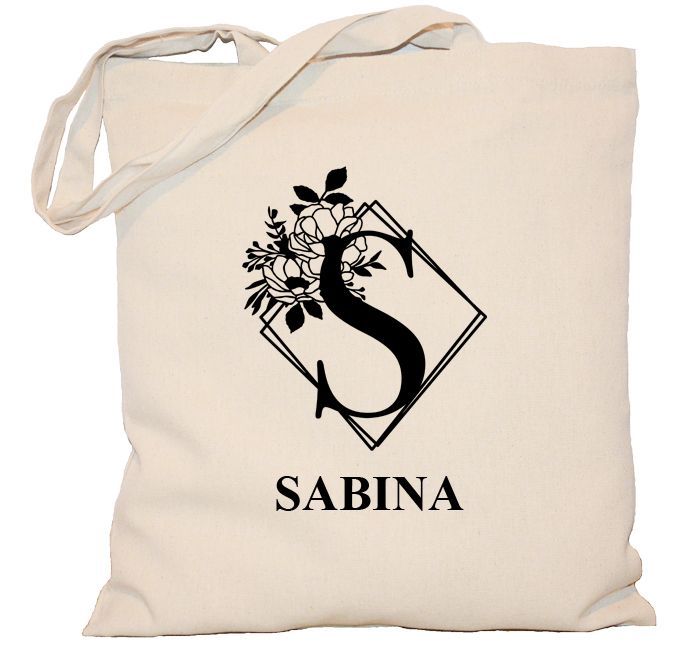 Torba z monogramem oraz imieniem. Dostępne są wszystkie litery alfabetu. Wszystkie litery są ozdobione w podobny sposób. Pod monogramem widnieje imię na literę, która występuje w roli głównej.