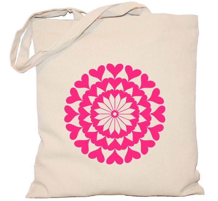 Torba z mandalą ułożoną z samych różowych serc. Mandala jest pięknym kształtem, którą można narysować z różnych elementów.