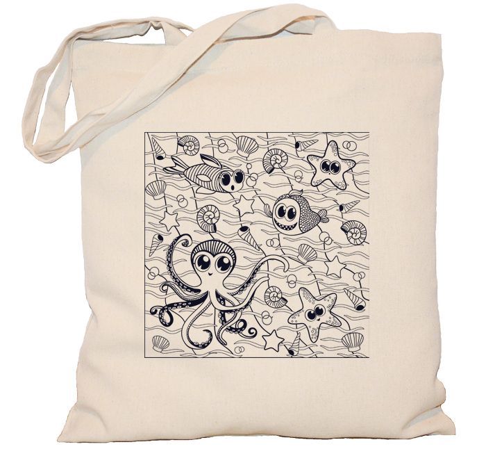 Torba z rysunkiem w formie doodle przedstawia morski świat. Torbę można pokolorować według własnego uznania lub pozostawić tak jak jest..