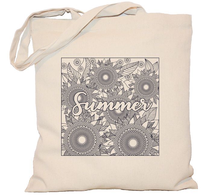 Torba z rysunkiem w formie doodle przedstawia mandale słoneczniki. Torbę można pokolorować według własnego uznania lub pozostawić tak jak jest..
