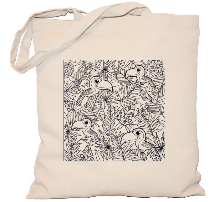 Torba z rysunkiem w formie doodle przedstawia mandale tukany. Torbę można pokolorować według własnego uznania lub pozostawić tak jak jest..
