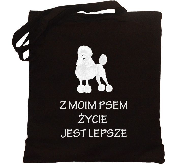 Torba z psem Pudelkiem i napisem "z moim psem życie jest lepsze". Wizerunek psa można zmienić na własne zdjęcie na przykład.