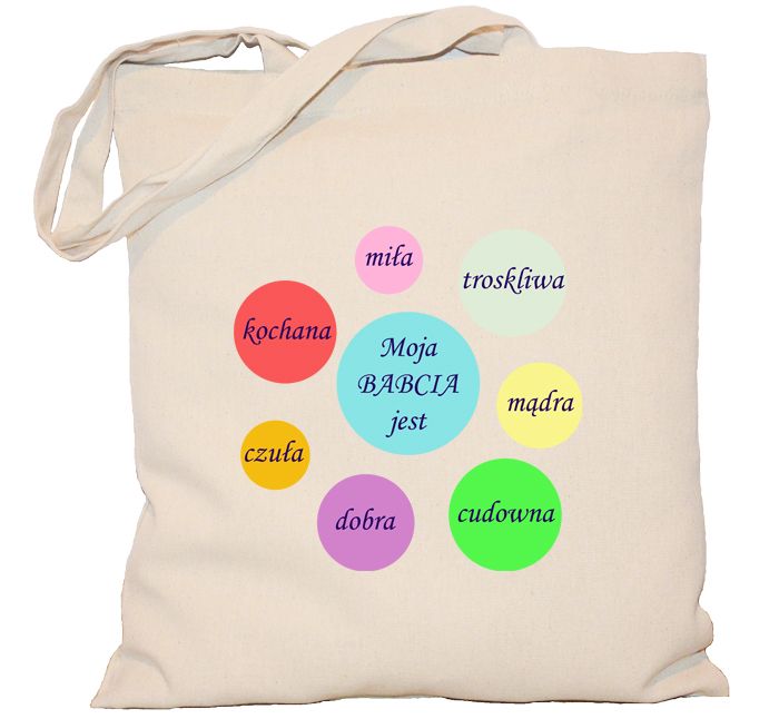 Torba na zakupy dzień babci, nie musi być nudna. My mamy do zaoferowania wiele modeli dla babć. Oto jedna z nich, zawierająca osiem kółek, które mają w sobie treść. W środkowym napis Moja babcia jest, a pozostałe kółka niosą ze sobą pozytywne cechy babci. Która jest między innymi troskliwa, miła, kochana, mądra, czuła, dobra i cudowna. Nasze, wysokiej jakości torby, zostały zrobione z bawełny. Są to bardzo wytrzymałe produkty, które posłużą z całą pewnością przez wiele lat.
