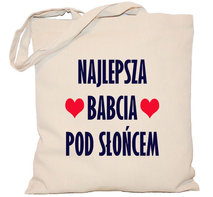 Oto wspaniały pomysł na prezent, czyli torba bawełniana na dzień babci z napisem Najlepsza babcia pod słońcem. I z dwoma czerwonymi serduszkami po bokach słowa Babcia. To z pewnością pomysł na podarek, który wywoła u niej uśmiech i sprawi wiele radości. Zwłaszcza, że zakupy robi się nie jeden raz, ale wiele razy w ciągu miesiąca. Torba ma nadruk DTG i jest solidnie wykonana.