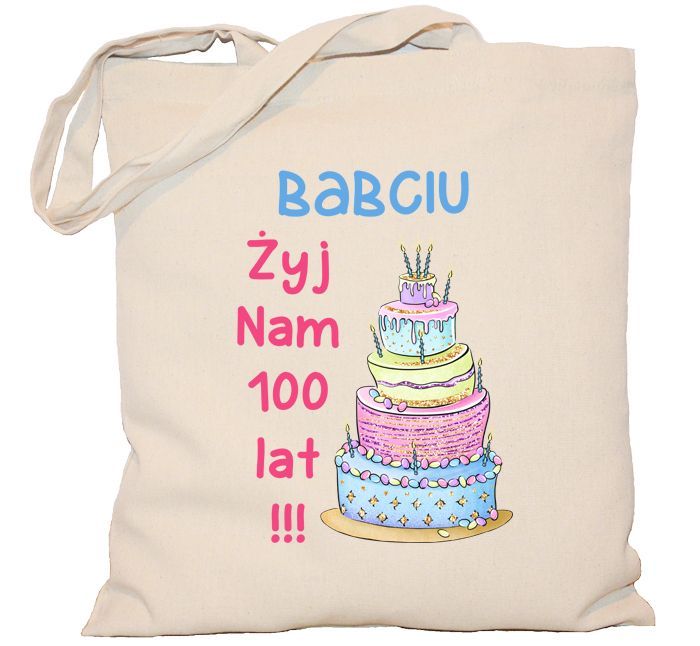 Torba bawełniana Babciu żyj Nam sto lat z kolorowym tortem.