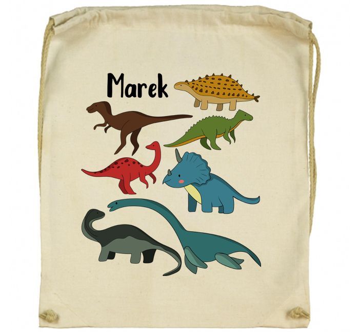 Workoplecak Kolorowe dinozaury z imieniem idealny do wyprawki szkolnej.